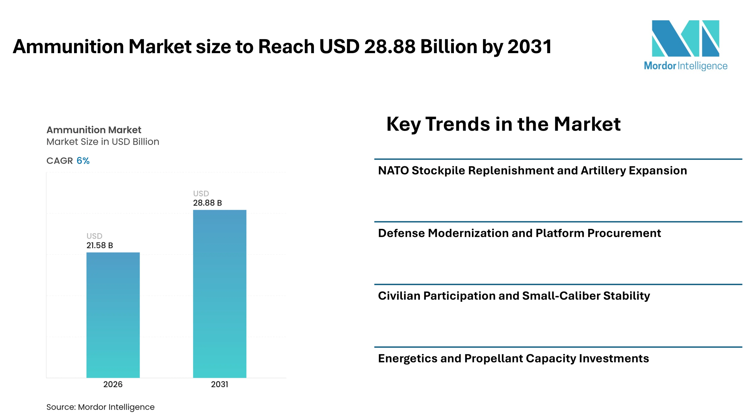 According to Mordor Intelligence, the ammunition market size is expected to grow from USD 21.58 billion in 2026 and is forecasted to reach USD 28.88 billion by 2031, registering a CAGR of 6.00% during the forecast period. Sustained defense procurement programs, artillery stockpile rebuilding initiatives, and modernization plans across allied nations are supporting ammunition market growth.