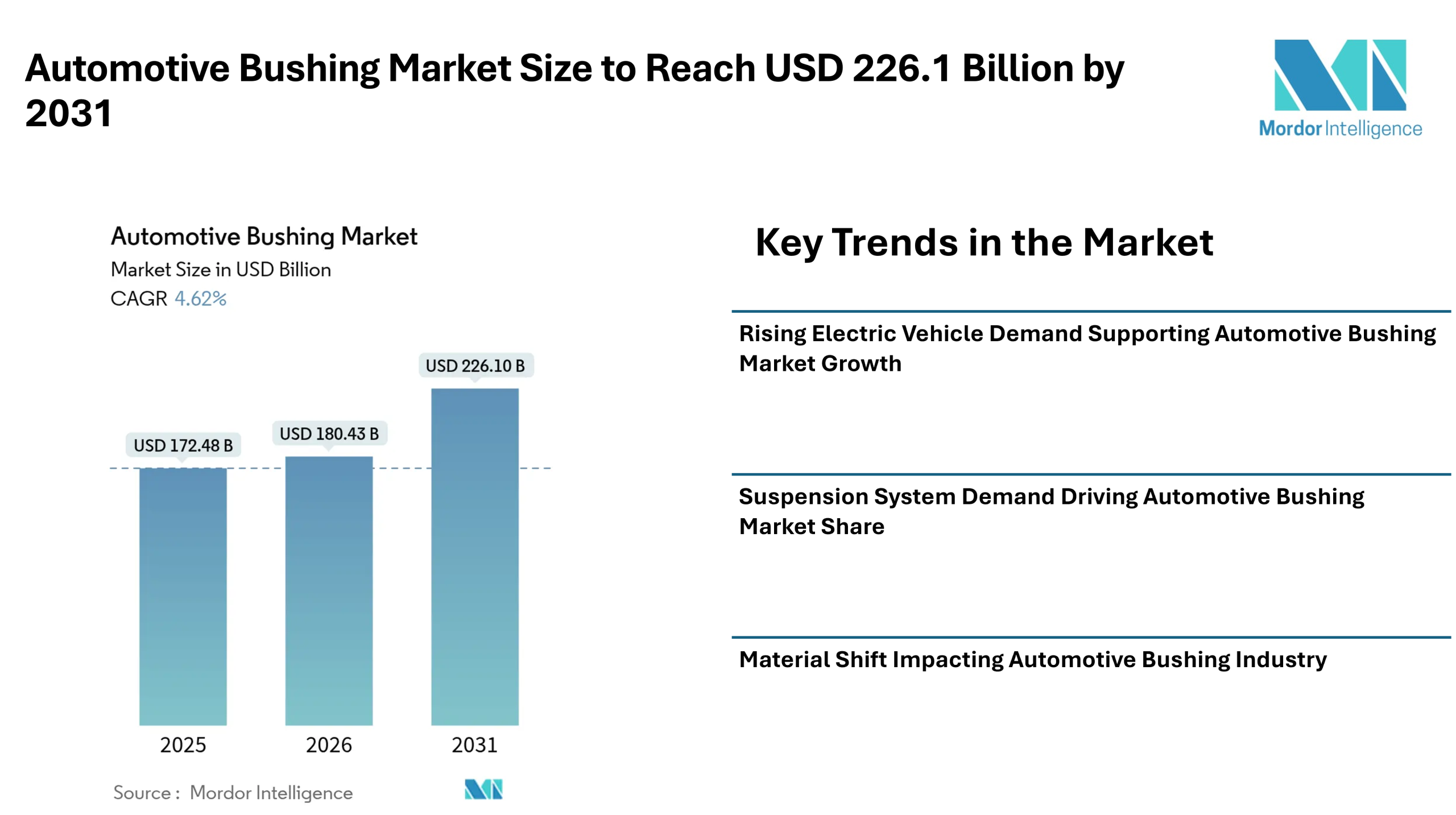 According to Mordor Intelligence, the automotive bushing market size is projected to grow from USD 172.48 billion in 2025 to USD 180.43 billion in 2026 and is expected to reach USD 226.1 billion by 2031, registering a CAGR of 4.62% during the forecast period. The study on automotive bushing market size indicates steady expansion as vehicle production stabilizes and electrification gains pace across major regions.