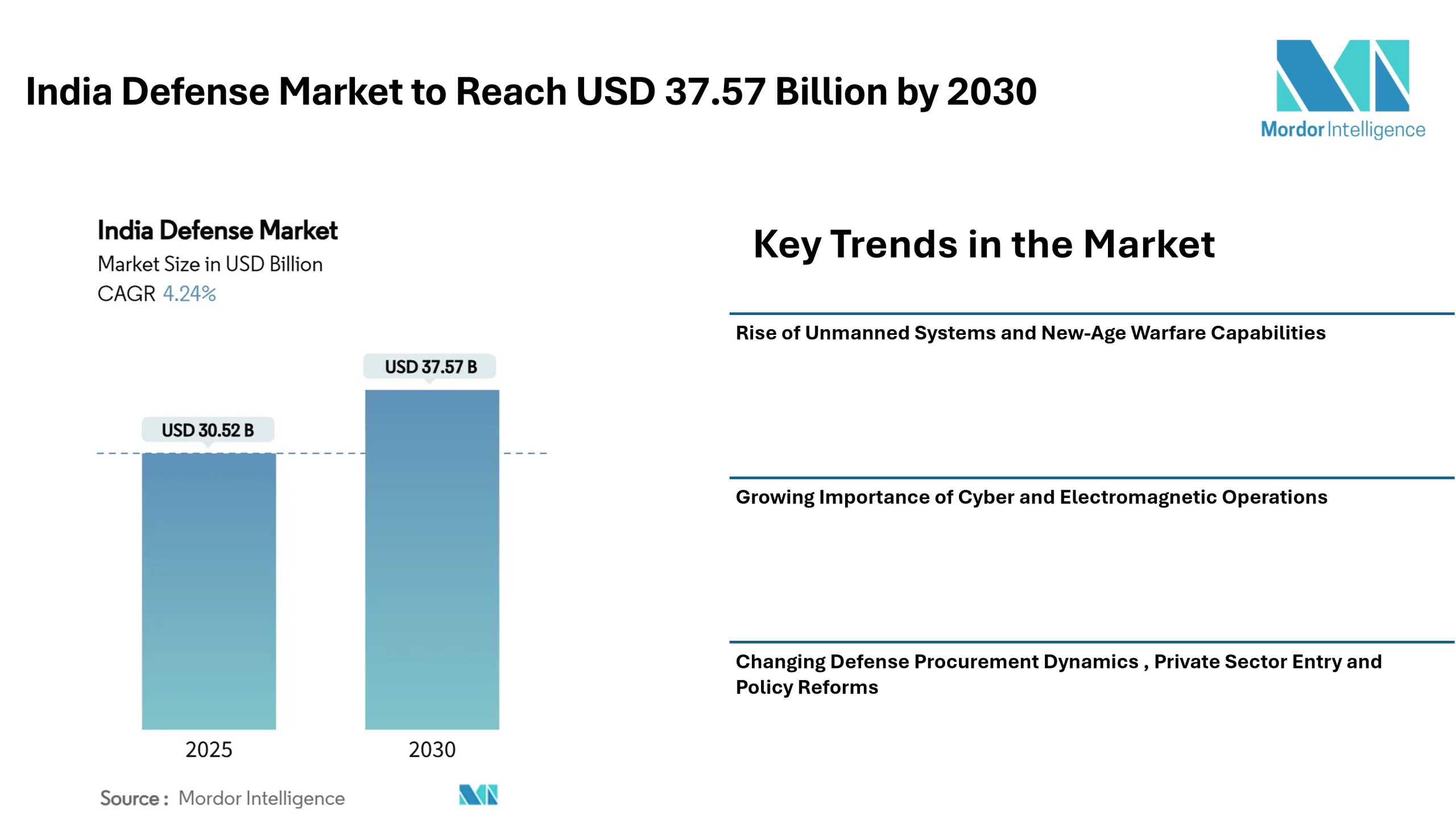 The india defense market stands at a critical juncture. With a projected growth to around USD 37.6 billion by 2030, the market is entering a phase where modernization, diversification, and self-reliance are becoming the defining themes. The combination of increased defense budgets, domestic sourcing mandates, and greater private-sector participation is transforming the supply landscape.