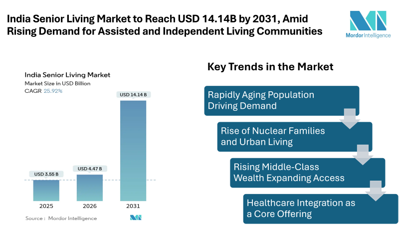 According to Mordor Intelligence, the India senior living market size was valued at USD 3.55 billion in 2025 and is estimated to grow from USD 4.47 billion in 2026 to reach USD 14.14 billion by 2031, registering a CAGR of 25.92% during the forecast period (2026–2031). The India senior living market is entering a high-growth phase, driven by demographic change, urban migration, and rising household incomes.