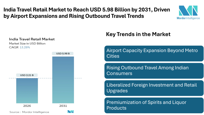 According to Mordor Intelligence, the India travel retail market was valued at USD 2.83 billion in 2025 and estimated to grow from USD 3.21 billion in 2026 to reach USD 5.98 billion by 2031, at a CAGR of 13.28%. Several factors are contributing to this expansion, including upgrades to airport infrastructure, increasing disposable income among the middle class, liberalized foreign investment regulations, and rising outbound travel by Indian consumers.