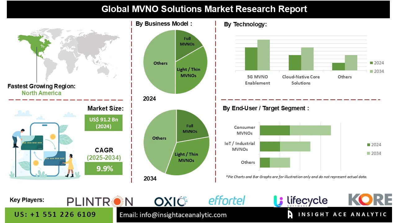 InsightAce Analytic Pvt. Ltd. announces the release of a market assessment report on the “MVNO Solutions Market”- By Business Model (Full MVNOs, Light / Thin MVNOs, Branded Resellers, Aggregator / Enabler MVNOs (MVNEs/MVNAs) ), By Service Offering (Core Connectivity, Mobile Data Services, IoT & M2M Connectivity, Value-Added Services (VAS), Enterprise & B2B Solutions, Digital-First MVNO Platforms), By Technology (Traditional Network Leasing, 5G MVNO Enablement, Cloud-Native Core Solutions, eSIM & Remote SIM Provisioning, AI/Analytics-Driven Network Optimization, VoWiFi & VoLTE Services, Open RAN / Virtualized Functions), By End-User / Target Segment (Consumer MVNOs, Enterprise & Corporate MVNOs, IoT / Industrial MVNOs, Content & Media MVNOs, Specialized / Niche MVNOs), and Global Forecasts, 2025-2034 And Segment Revenue and Forecast To 2034.”
