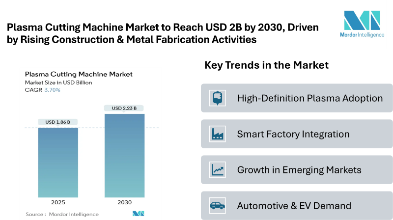 According to Mordor Intelligence, the Plasma Cutting Machine Market size is estimated at USD 1.86 billion in 2025, and is expected to reach USD 2.23 billion by 2030, at a CAGR of 3.70%. This market expansion is primarily fueled by the increasing adoption of automated systems, rising demand from automotive and transportation sectors, and the ongoing shift toward digitalized metal fabrication processes. The Asia-Pacific region currently leads the market in size, while South America is emerging as the fastest-growing region, reflecting strong demand from small and medium-sized enterprises (SMEs) and industrial expansion.