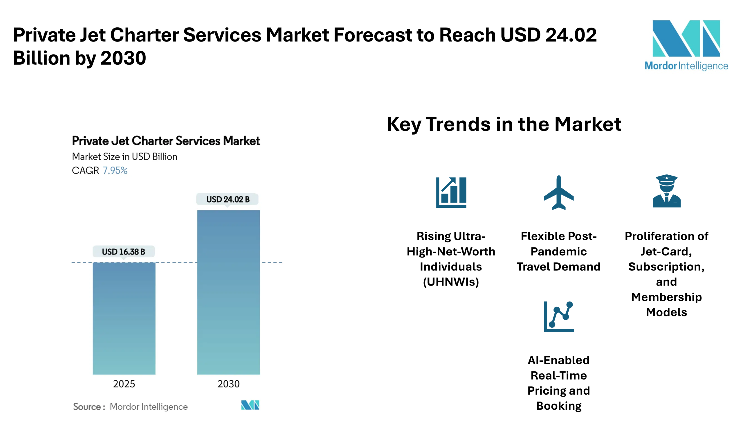 According to a recent analysis by Mordor Intelligence, the private jet charter services market reached USD 16.38 billion in 2025 and is forecasted to reach USD 24.02 billion by 2030, securing a 7.95% CAGR that signals durable expansion across global business and leisure travel. This forecast underscores sustained demand across both corporate and leisure travel segments, driven by increasing ultra-high-net-worth individuals (UHNWIs), flexible travel preferences, and advanced digital platforms.