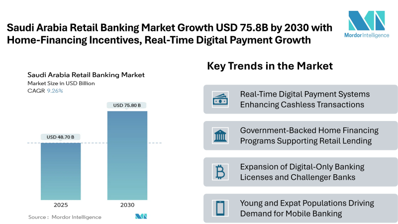 According to Mordor Intelligence, the Saudi Arabia retail banking market size stands at USD 48.7 billion in 2025 and is forecast to reach USD 75.8 billion by 2030, advancing at a 9.26% CAGR. Online banking is becoming an increasingly significant part of retail transactions, while Islamic finance continues to play a major role in total banking assets.