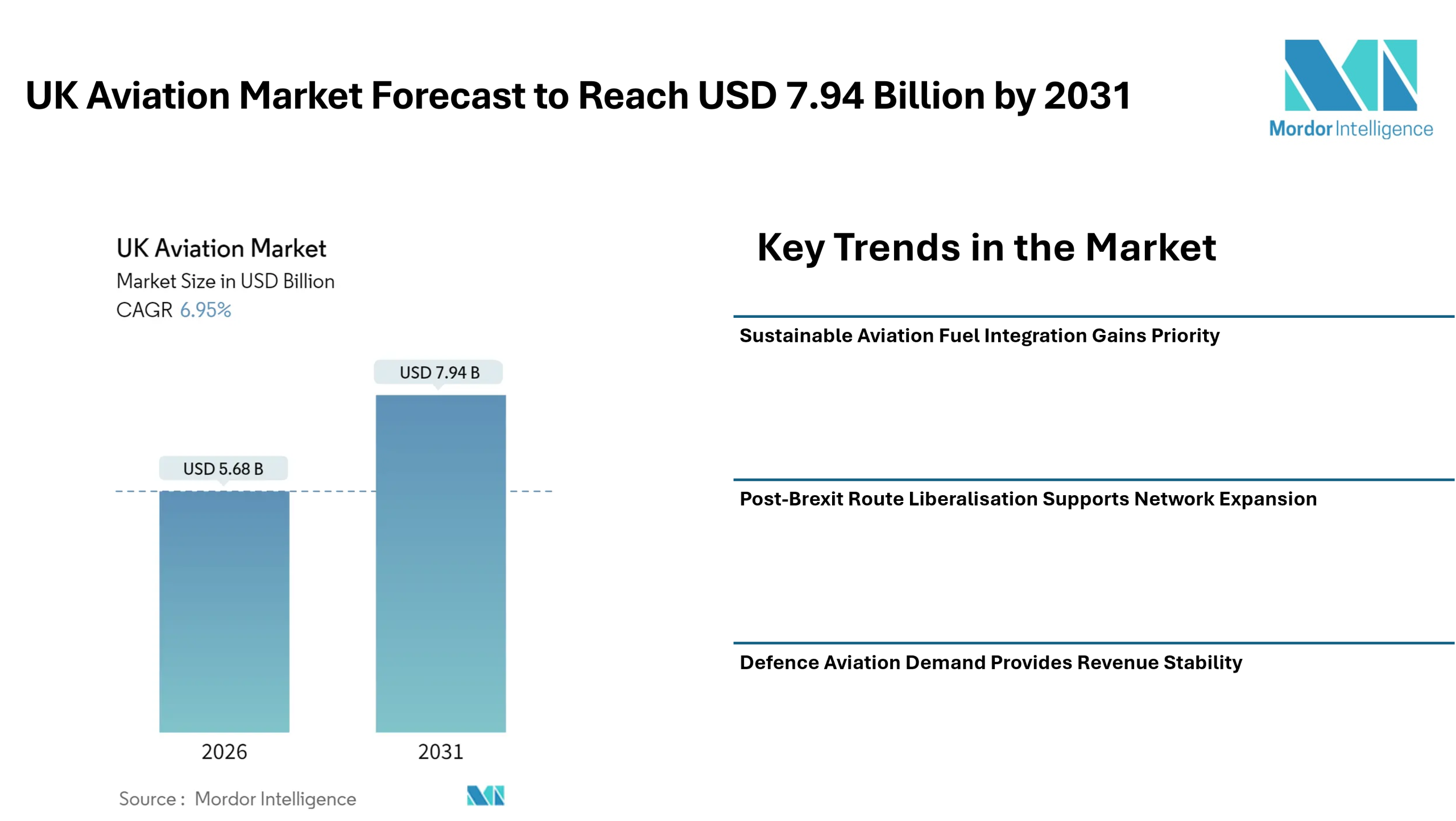 According to Mordor Intelligence, the UK aviation market size was valued at USD 5.68 billion in 2026 to USD 7.94 billion by 2031, reflecting a CAGR of 6.95% during the forecast period. This outlook underlines a balanced recovery supported by civil aviation demand, government defence spending, and policy-driven sustainability goals.