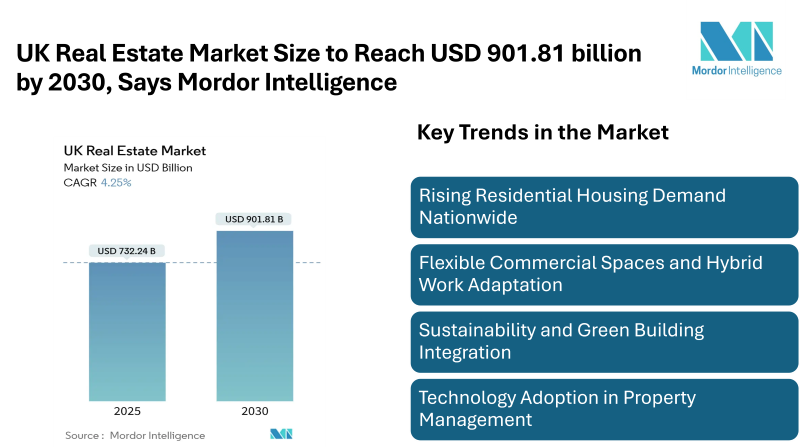 According to Mordor Intelligence, the UK Real Estate Market size is estimated at USD 732.24 billion in 2025 and is expected to reach USD 901.81 billion by 2030, at a CAGR of 4.25%. The outlook for the UK real estate market share reflects continued expansion in urban hubs while supporting regional development projects, positioning the sector as a key contributor to the overall real estate landscape in the UK.