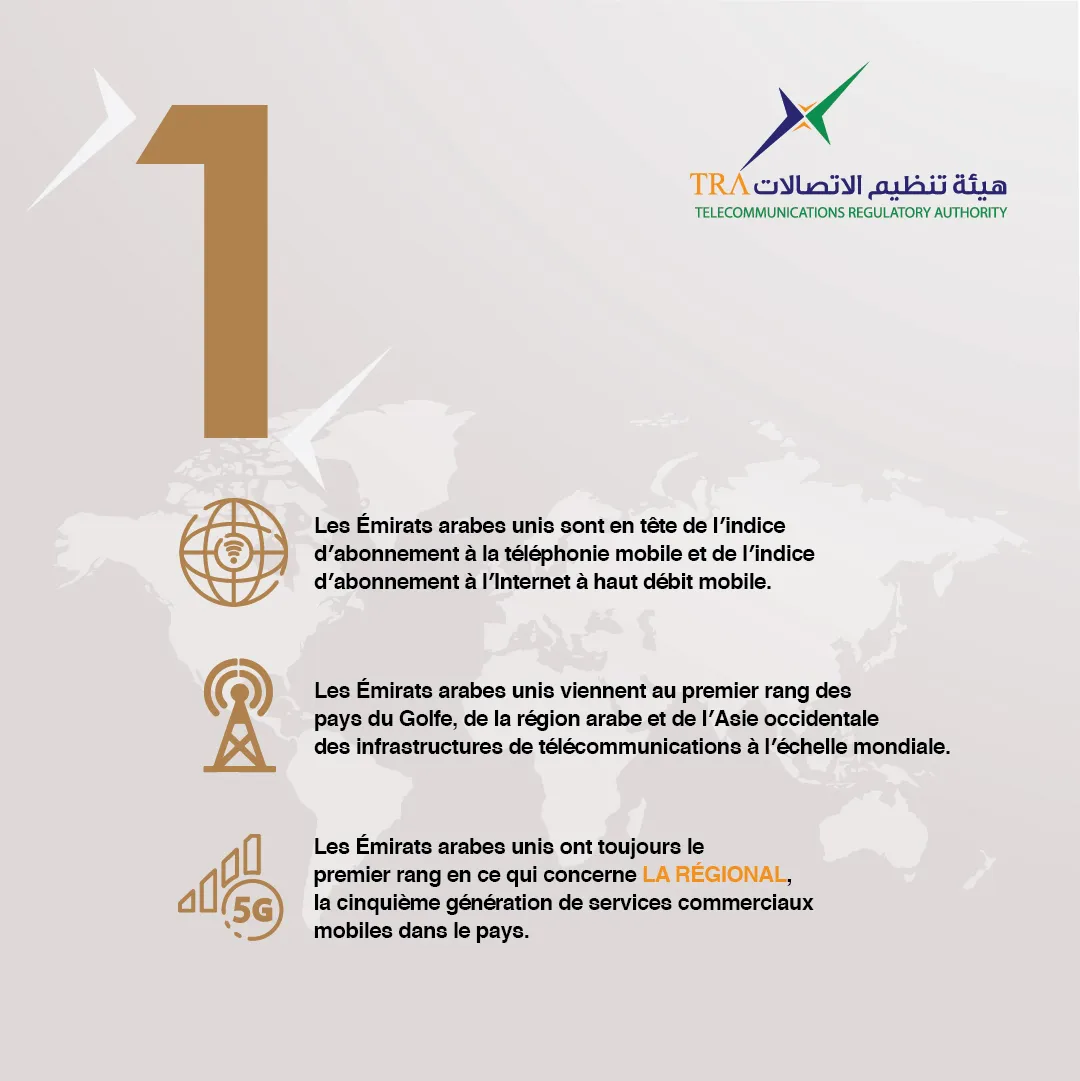 Tout au long de l’année 2020, les Émirats arabes unis ont su conserver leur première place au classement mondial des abonnements à la téléphonie mobile et sont même passés de la deuxième à la première place dans l’indice des abonnements à l’internet mobile à haut débit. Les Émirats arabes unis se positionnent en outre à la première place dans le monde arabe et au niveau régional dans l’indice des technologies de l’information et de la communication, ainsi que dans l’indice relatif à l’accès à l’internet et à l’utilisation de l’internet.